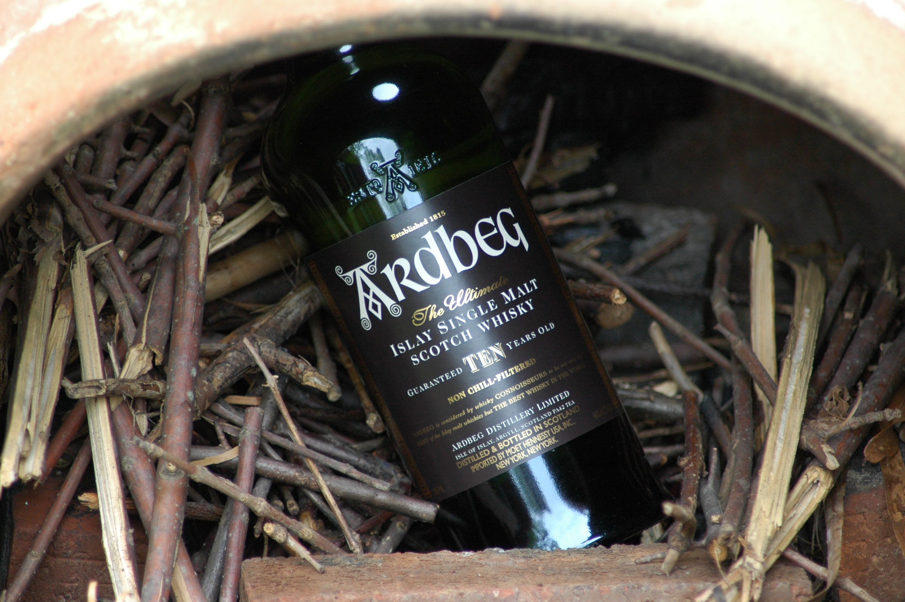 So when I decided to take a photo of this precious one, I thought I’d find a nice patch of green grass to complement the green bottle.I happened to walk by my fire pit, or Chimnea. I had placed some small wood in it already and thought, yes, it is only fitting for a peaty “fired” malted barley whisky to be placed in there. So there you go.